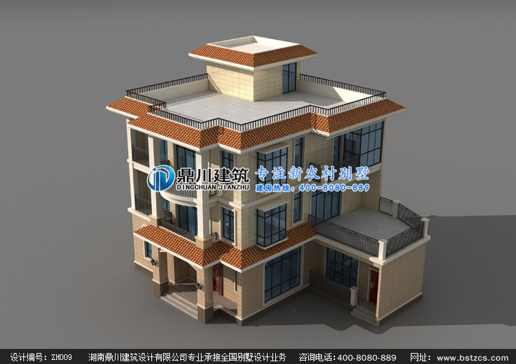 ZH009三層平屋頂農村自建房設計圖效果圖,新農村三層帶屋頂露臺別墅圖紙效果圖