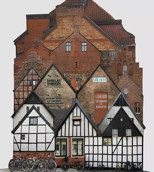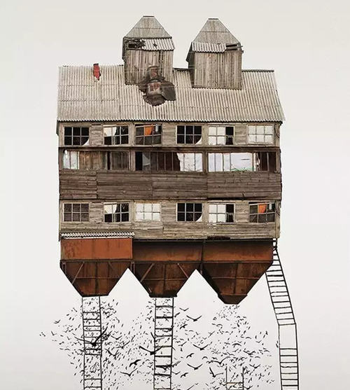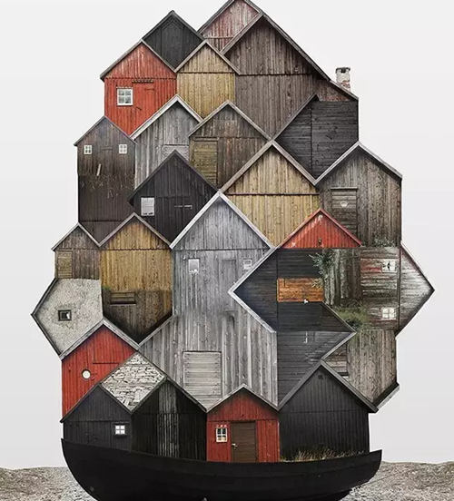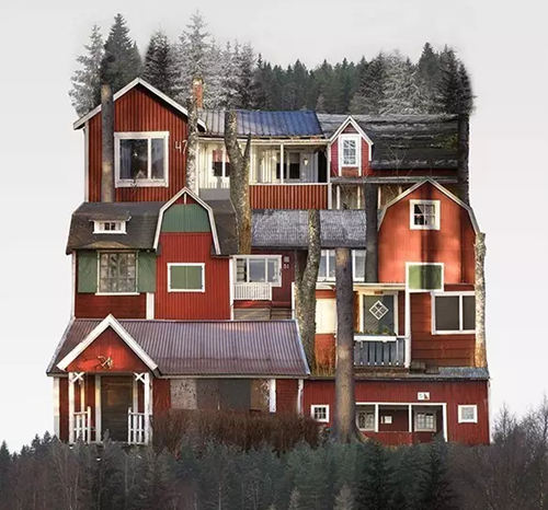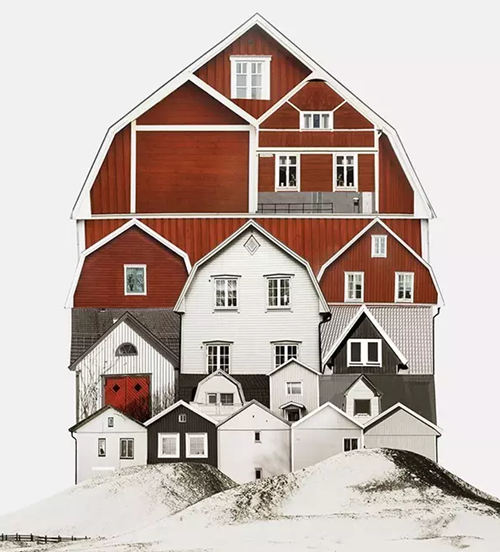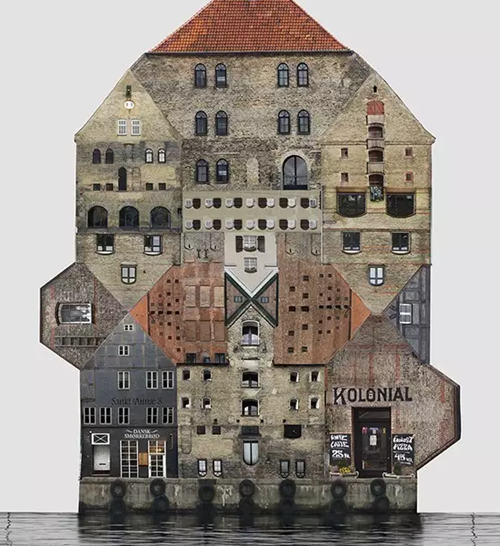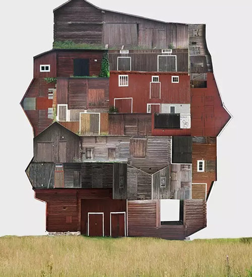 該系列拼接畫名為“genius loci(地方風(fēng)氣)”,描繪了由許多小房屋構(gòu)成的大房子,這些房屋都是某個地方或國家特有的風(fēng)格。它們連接著這些地方的土地,承載著這些地方的精神,不僅體現(xiàn)了虛擬的建筑現(xiàn)實(由各種門窗隨意、古怪地堆積在一起),而且體現(xiàn)了當(dāng)?shù)氐奈幕蜕罘绞健?/p>