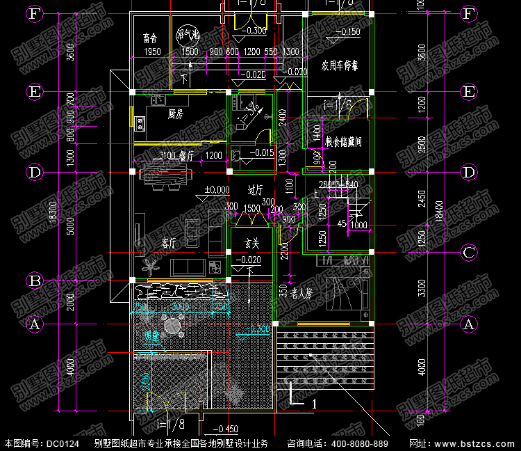 一 層: | 客廳、老人房、廚房、餐廳、衛生間、儲藏間、農用車庫、畜舍 | |||
