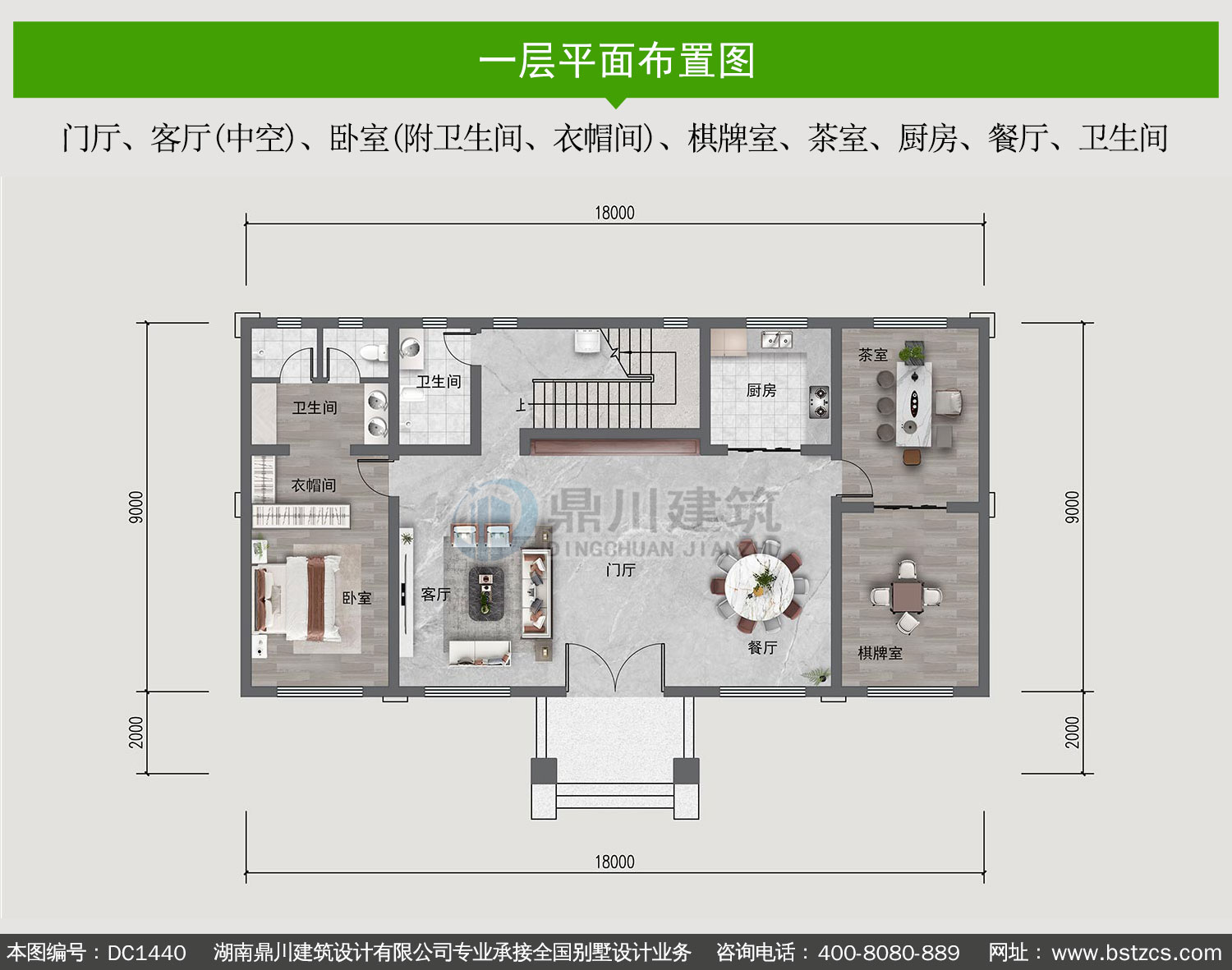 | 一 層: | 門廳、客廳(中空)、臥室(附衛生間、衣帽間)、棋牌室、茶室、廚房、餐廳、衛生間 | |||