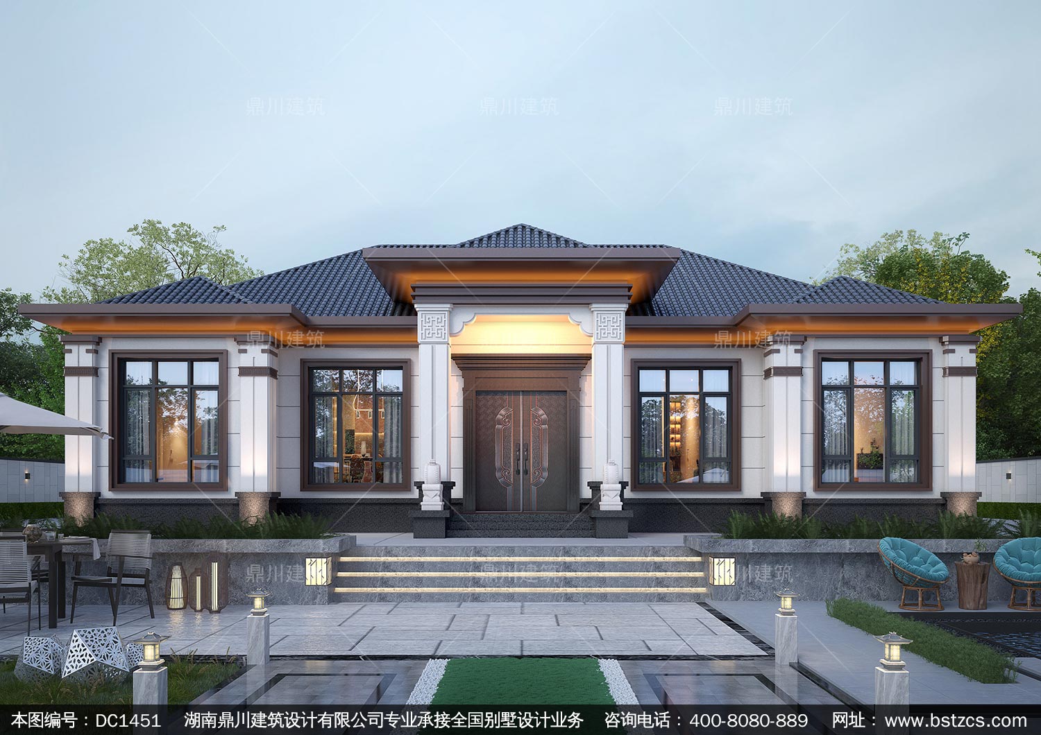 大氣新中式一層別墅設計圖紙及效果圖_農村自建房設計,鼎川建筑